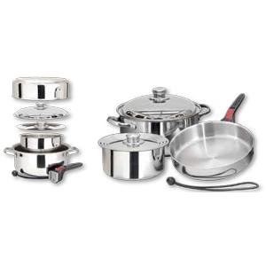The quality and value youve come to expect from Magmas current 18-10 stainless steel cookware sets now available in a 7 piece starter set This nesting cookware stores in less than 12 cubic foot of space Includes 5qt Stock pot 9-12 saute pan stock potsaute pan lid 2qt sauce pan univers