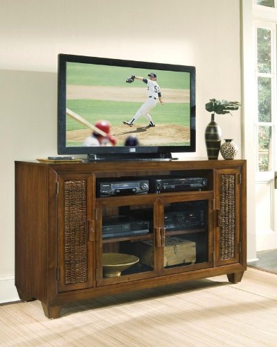 This cabana banana entertainment credenza provides wide space for wide screened TV electronics and DVD storage Its 60-inch width will accommodate larger flat screened TV It has 35-34-inch open compartment and a two glass door cabinet with an adjustable shelf which is convenient for house electr