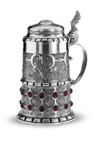 The Artina Pewter Rubin Beer Stein with inlaid red Swarovsky stones 7 12 in tall - 3 316 in rim - 4 14 in base Holds approx 236 oz - 2lb 05oz wt German pewter
